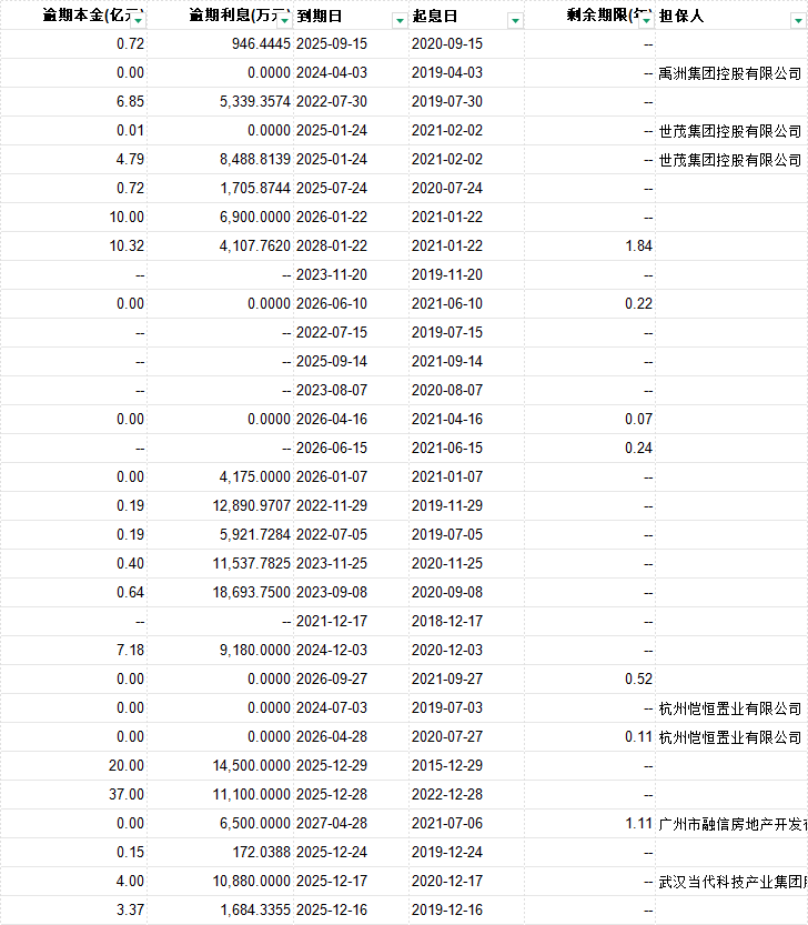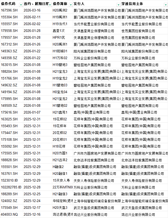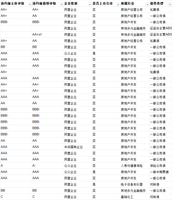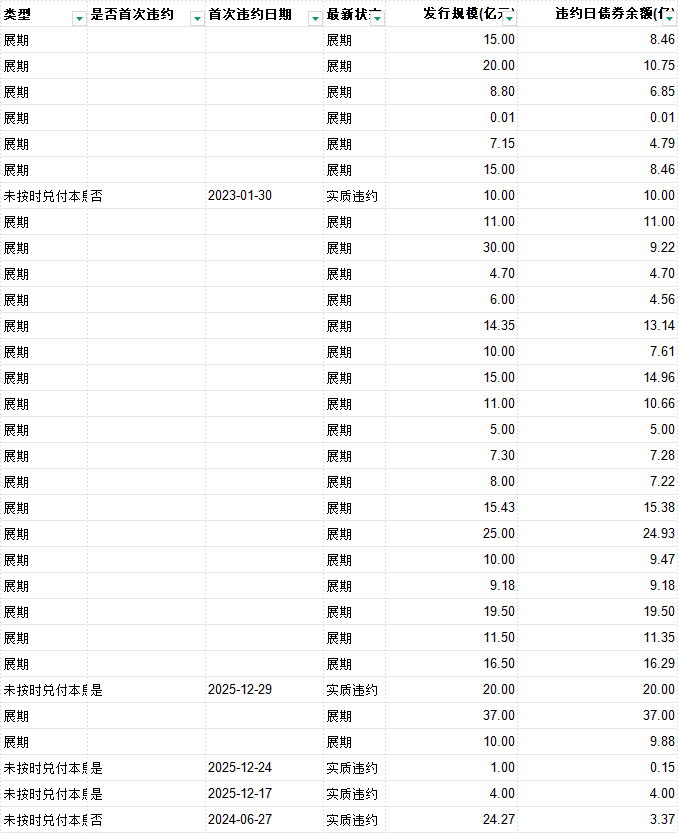 债券代码 违约、展期日期 债券简称 发行人 穿透信用主体 类型 是否首次违约 首次违约日期 最新状态 发行规模(亿元) 违约日债券余额(亿) 逾期本金(亿元) 逾期利息(万元) 到期日 起息日 剩余期限(年) 担保人 违约前主体评级 违约前债项评级 企业性质 是否上市公司 所属行业 债券类型 主承销商 交易所