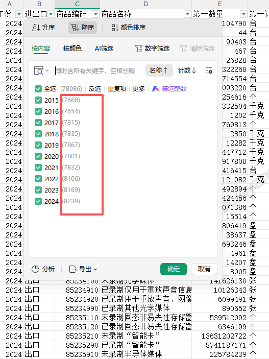 中国对世界HS8位数代码 出口金额、数量 2015~2024,注意是中国对“世界”的出口,世界不拆国家、不再拆分出口到了哪个国家。