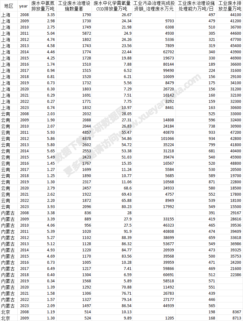 各省份污水排放、治理数据 2008~2023,个别指标有少量缺失,介意勿拍